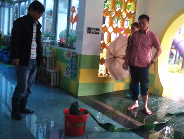 领导先后视察了茶山幼南教学楼的各教室淹水情况、园内各个排水点,雨水进口和出口处。指导幼儿园及时采取有效措施,科学防汛,力争将损失降到最低,确保全园师生的人身安全。 他们分析用水泵进行现场排水,进口处用沙袋堵住,控制水势进入各活动室,及时消除安全隐患。被淹教室的幼儿也被妥善安排在多功能活动室及其它安全教室进行正常活动。