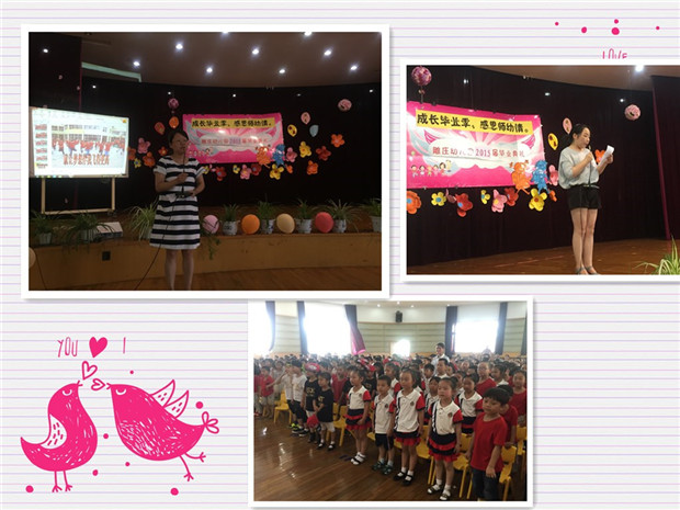 整场毕业典礼,共有三个环节,分别为:回忆篇、进步篇以及祝福篇,在园歌合唱节目中,开始了这场难忘的毕业典礼。首先是回忆篇,一张张照片,带大家一起回忆了幼儿园三年的学习生活,这些回忆,充满了欢笑与感动。离别之际,大四班小朋友带来的歌表演《朋友,别哭》鼓励着伙伴们微笑说再见,大三班小朋友rap版的《夸夸我的幼儿园》,更让大家耳目一新,沉浸在身为雕幼学子的自豪里。