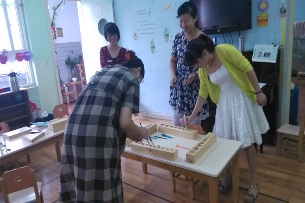通过培训让我们知道了蒙氏教育内容是非常宽泛的,蒙氏科学幼教没有课表,不划分上下课时间,让儿童寻着内心的需求,自由的专心工作,蒙氏老师告诉我们孩子的专心时刻如果被打断,会养成孩子虎头蛇尾的习性。反之,这种经重复练习而延长工作的时间,则能培养孩子重要的良好习性专心和耐力首要的目标,是致力于培养人格健全的孩子。蒙氏老师还给我们演示“日常生活技能”的练习,如练习走路,正确的呼吸、说话乃至开抽屉,做针线活,倒豆子,远近距离的摆放等等。通过一系列操作演示,是我们对蒙氏教育又有了重新的认识。