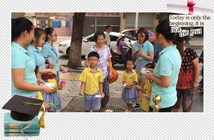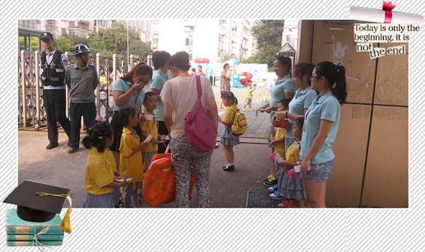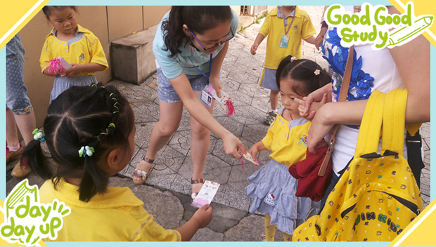 瞧!孩子们一个个抬着头,挺起了胸, 微笑着与老师们打招呼,声音清脆洪亮,多神气呀!当他们拿到这些小书签后,便如快乐的小鸟般飞进了校园。他们着急地去到自己的新教室,在书签上画上自己的小小心愿。而老师们则用手中的相机不断捕捉着孩子们欢乐的身影和最灿烂的笑脸。