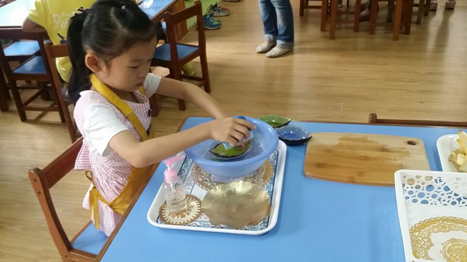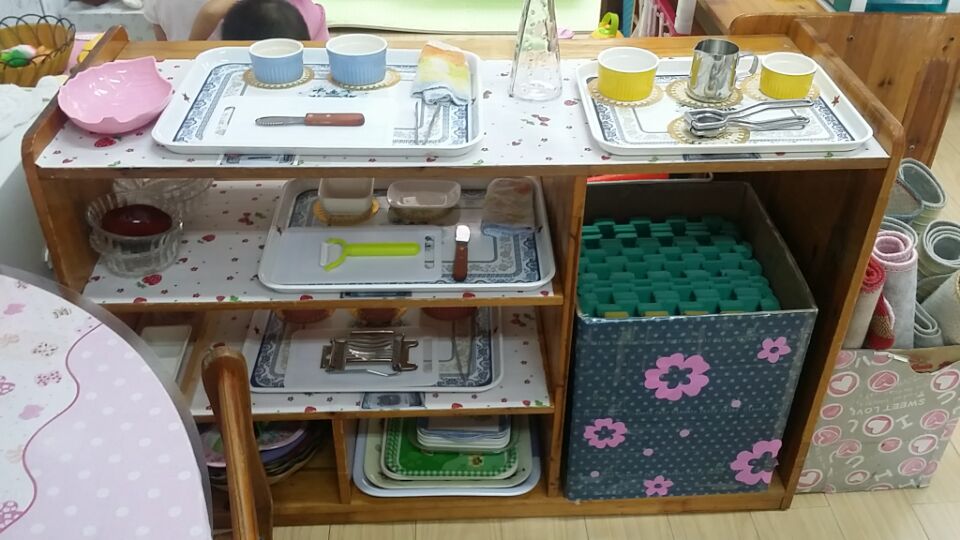 一整套“蒙氏”教具可以涵盖“蒙氏”个别化活动中感官区、数学区、文化区的全部内容,这些教具从材质、规格大小到颜色都有明确的规定,而日常生活区的教具则需要教师自行添置。日常生活区的活动主要通过对材料的摆弄和反复的动作练习,培养幼儿的小肌肉动作,为幼儿日常生活行为奠定基础,如使用调羹、使用剪刀、抓握小颗粒物件、折叠、倒水等。因此,该区域的教具添置既要还原生活,又要符合幼儿的年龄特点,让幼儿在模拟的环境中摆弄操作,培养专注力和秩序感。