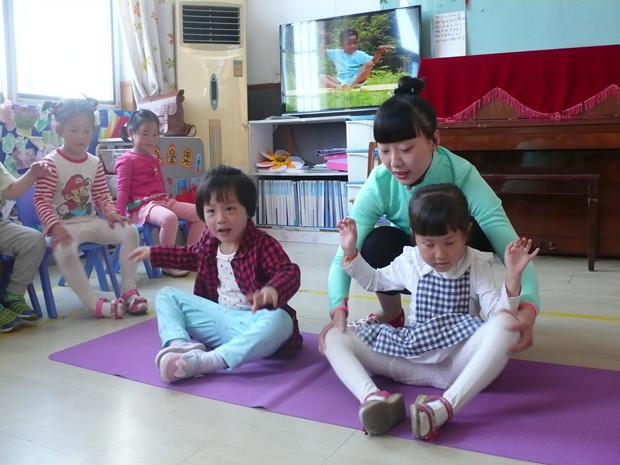 “大树式”、“鱼式”……在轻柔的音乐声中,大班周淳静的妈妈正在教孩子们做瑜伽。静坐与模仿动物的各式呼吸法让孩子的心安静了下来;小家伙们认认真真地学做动作,伸展身体,开阔心胸。