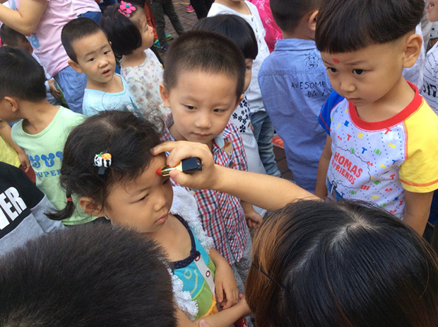 最后,活动进入了高潮,根据“朱砂开智”的寓意,主持人引领各班老师利用口红为孩子在眉心点“朱砂”,为孩子们的成长点燃了智慧。同时,家长为孩子们赠送了自己预先准备的一份有意义的礼物,活动在一片祝福声中接近了尾声。