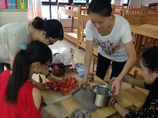 这次厨艺大赛让大家看到了园丁们不为人知一面——她们在校园里心系孩子,用自己的智慧和爱演绎每一次课堂的精彩,关注每一个生命的成长,而当她们走出课堂,依然可以用双手挥洒出一片精彩的天空。生活是多姿多彩的,不仅仅教书育人要有声有色,业余也要有滋有味。在幼儿园的食堂里,老师们一边择菜一边拉家常,其乐融融;在幼儿园的活动室里,老师们相互协作,将桌椅相拼,早早将“餐厅”布置得温馨而舒适。