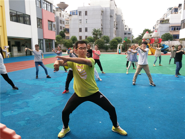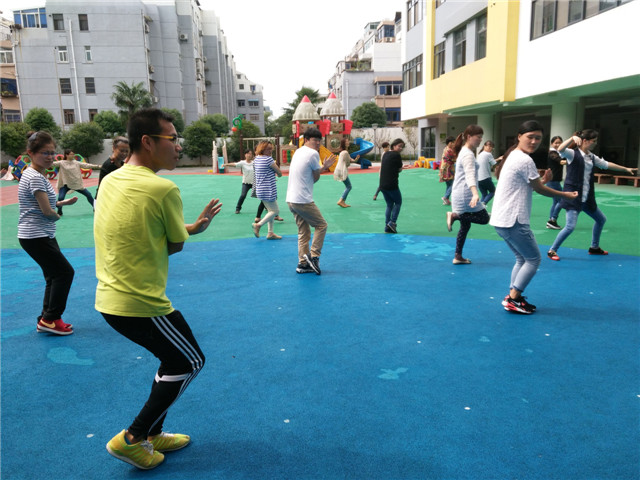 自十月第一天起每天早上8点10分,只要是早班的老师们都准时而又整齐地聚集在幼儿园操场上,排成整齐的方阵,在参赛老师的指引下,时而柔然连贯、时而刚劲有力、刚柔并济韵味十足。从9人参赛到全园普及,这一晨间操不仅仅是每天锻炼身体的一种形式,更是强化原本特色的又一有力举措。