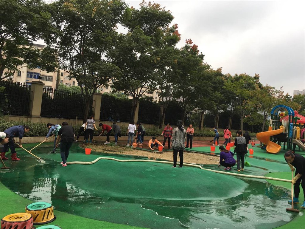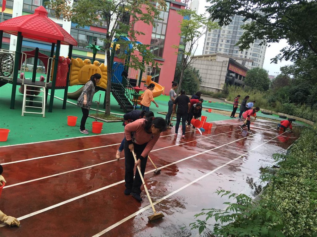 10月9日中午,孩子们进入甜蜜梦乡后,老师和阿姨们拿起地刷、拖把、扫帚、水管等劳动用具来到幼儿园操场。幼儿园的塑胶操场是幼儿晨间活动的重要场所,经过一个梅雨季节,花坛、地面、沙坑上到处布满灰尘、泥土和落叶。教师和阿姨们共同商议、分工合作,各尽其责,不怕苦、不怕累、不怕脏,用心打扫着每一个角落,清扫每一处的卫生死角。经过一个多小时的努力,幼儿园操场上被洗刷得干干净净,地面上焕然一新,到处整洁而明亮。