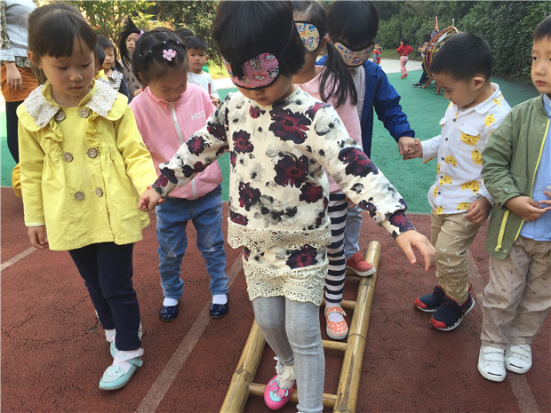 为了让幼儿保护自己的眼睛,也知道盲人的困难以及如何去关爱盲人。今天上午,孩子们都带来了眼罩,遮住自己的眼睛,来亲自感受眼睛看不见的感觉。当遮住孩子们的眼睛的时候,孩子们都说:“老师好黑啊!”“我前面是谁呀?”当把光明还给孩子们的时候,孩子们都会很开心,说:“眼睛看不见好难受的。”通过游戏环节,让孩子自己感受到了眼睛的重要性,懂得了应该好好保护自己的眼睛。通过与其他同伴合作,完成走梯子、爬垫子更加让幼儿了解到团队合作的重要。