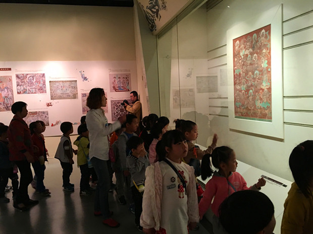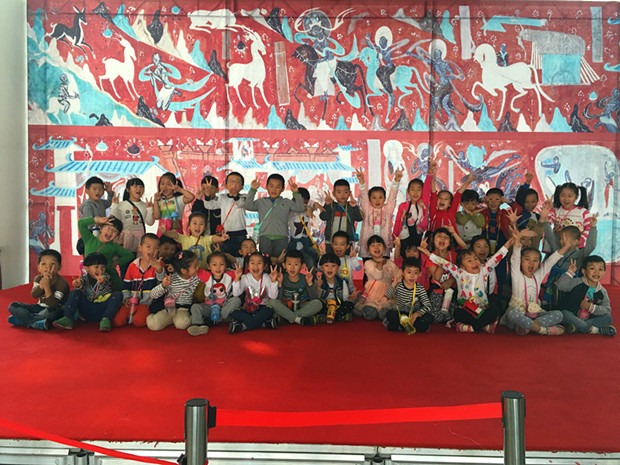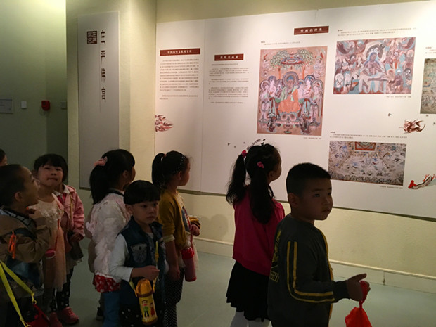 早晨8:40分,孩子们准时来到了常州市民广场。随着9点钟,常州博物馆准时开门,彩虹幼儿园大班年级组的孩子们与老师一起进入博物馆里进行敦煌展的参观。当孩子们刚走进展馆,就被眼前美丽的壁画所吸引了,孩子们虽然还不能完全认识图画的含义,但为孩子们认识我国灿烂的文化提供了一个契机。随着参观到达尾声,今天活动的另一个重要环节——远足也即将开始。孩子们在老师的带领与鼓励下,都雄赳赳、气昂昂地排着整齐的队伍,一起走回彩虹幼儿园。在远足的过程中,虽然天气比较炎热、路途有点远,但对于孩子们来说,也是一种挑战与锻炼。孩子们利用了1个小时的时候,都安全地抵达了彩虹幼儿园。
