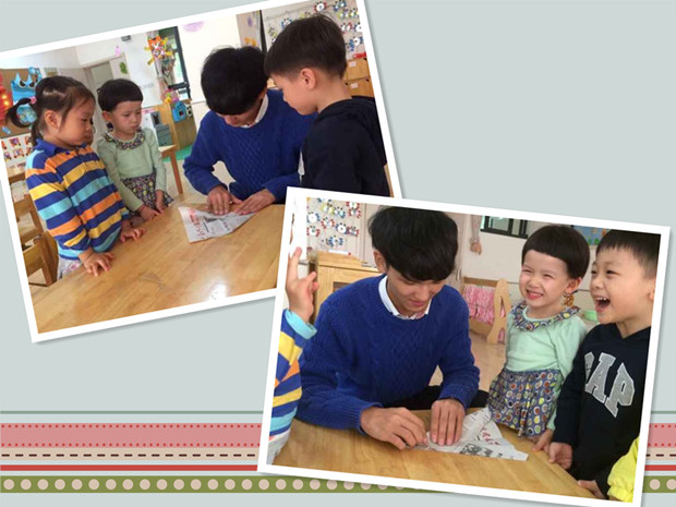送完礼物之后,中班哥哥姐姐们还提议要和小班弟弟妹妹们做游戏,为此中班组的老师们组织了“吸纸跑”大带小活动,由中班哥哥姐姐们教小班弟弟妹妹们将报纸平摊放于胸前,快速跑动让报纸由于阻力牢牢的吸附在身上。在活动中,孩子们奔跑的身影在操场上穿梭,欢快的笑声在操场的上空回旋…… 本次活动不仅通过折纸锻炼了幼儿的观察力、想象力、创造力和实际操作能力,还通过赠送礼物的方式增进了中、小班小朋友之间的感情,使孩子们在幼儿园生活得更加快乐和温暖。