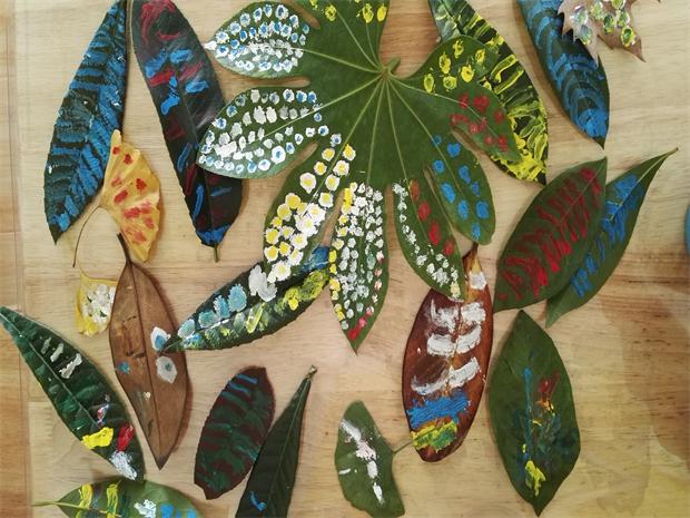 小朋友将花园里、社区旁捡来的树叶请进教室。在美工创意区,孩子们用棉签棒蘸着各种颜料,给小树叶“换上新装”:枫叶的红色、稻谷的黄色、果园的绿色、橙色……各种颜色顿时跃然叶上。小树叶不再是枯黄的,孩子眼中“秋天的色彩”让小树叶变得五彩斑斓。在老师的鼓励和引导下,孩子们的想象也越来越丰富,各种图形和线条交织着不同的色彩,像豹纹、像羽翼、像花布……孩子们感受到了色彩涂绘的快乐。