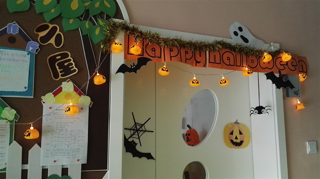 家长们早早地作了准备,有的买,有的动手做,南瓜灯、骷髅头、巫婆的扫帚、小精灵等装饰物悬挂在走廊、门窗、活动区……,让整个幼儿园充满了神秘、梦幻般的通话色彩。