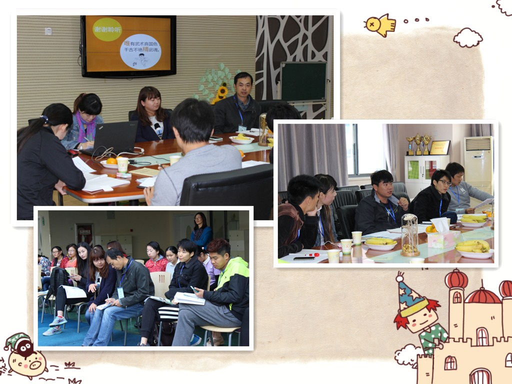 本次活动共分三个环节,第一个环节是观摩幼儿的晨间活动和晨间早操律动。第二个环节是观摩2名青年男教师的体育展示课。第三个环节是观看丽华三幼“阳湖拳”特色创建历程以及工作室研讨交流。首先钱亢工作室的老师对丽华三幼的武术园本课程很是欣赏,表示无论是晨间操还是游戏活动,每一个环节都渗透着阳湖特色。接着两位执教老师同工作室的体育教师针对教材教法、目标达成和动作教学突破等方面进行了互动交流。最后,钱亢老师以2节展示课为着力点,就“落实教学理念”和“如何进行体育教学活动的评价”进行了简短的总结,他指出,不论是幼儿体育教学还是小学体育教学,始终离不开教学目标的指引,只有在活动中牢牢把握住目标,才能把握住了活动的重点和中心,并用“巧、美、趣、真”四个字阐述了今天联动活动的感悟。钱老师用幽默的语言,极具感染的亲和力同老师们进行了交互式的沟通研讨,他独到的教学理念和多变的教学思路更是激起了青年教师们真挚的求知欲,不同教学思路的交汇使会议室里充满了智慧的火花。