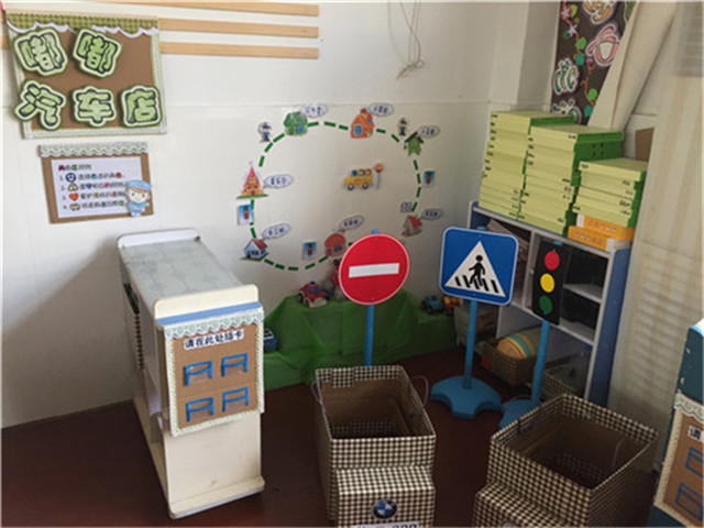 在教室里,老师们创设了“嘟嘟汽车店”、“嘟嘟大冒险”、“嘟嘟奇妙屋”等区域,并投放了许多自制的游戏材料:比如在“汽车店”,孩子们可以装扮成小司机,去租赁一辆自己喜欢的“车辆”,并且可以把这辆“车”到“马路”上去开一开;在“冒险屋”,老师们提供了跟多跟汽车有关的益智类玩具,孩子们需逐一“闯关”;在“奇妙屋”,孩子们可以利用各种积木搭建自己心目中的“马路”,并在各个路口安放相应的交通标志……各个区域,让孩子们在游戏的过程中巩固课堂中所学,寓教于乐。
