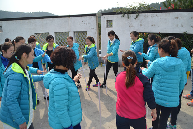 在培训过程中,老师们被随机分成二队开展了“破冰”、“不倒森林”、“撕名牌大赛”、“高空断桥”、“鼓舞人生”等一系列难度较高的拓展项目并进行了小组和集体分享。特别是在“鼓舞人生”游戏过程中,二个小队由相互防范、竞争,到后来二队幡然醒悟,共同合作、齐心协力共渡“难关”。通过游戏让每一位队员真切的感受到每一个人的智慧和潜能以及团队合作的重要性。