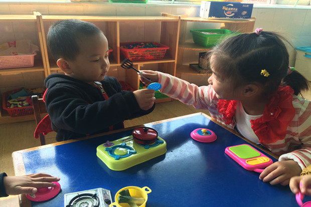 当孩子们看到那些炊具可高兴啦,因为他们的模仿意识非常强烈,平时在家经常看大人们在厨房里捣鼓,他们早就想尝试了,如今幼儿园有这么好的机会,他们岂会错过?只是过了一会儿,走过去一看,烧饭的东西掉的满地都是,有时他们还会为了争抢而不高兴。尽管如此,他们还是愿意去摸一摸、看一看、做一做。我们发现孩子们慢慢有了语言上的交流,他们会把那些水果蔬菜放到锅里煮一煮或者放些调料,对我说:“老师,我在做菜呢!”还对另一个孩子说:“你别碰我,这里有辣椒辣眼睛!”在娃娃家里,孩子们的社会性逐渐体现出来,他们开始有了交往和交流,逐步有了分工与合作。在这样的游戏环境中,孩子们都沉浸在快乐之中。