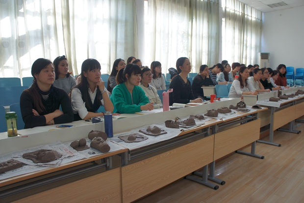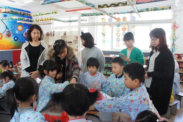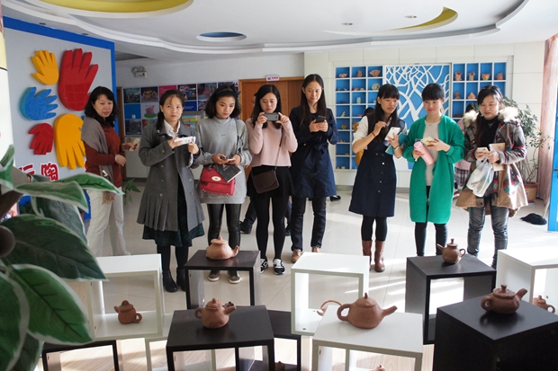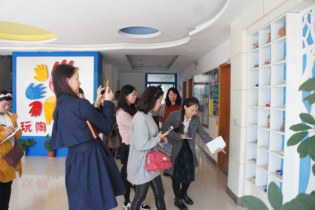 活动当天由朱薇园长带领南京的老师们参观幼儿园环境创设,感受浓厚的陶艺氛围;然后观摩由大班徐舒琼老师执教的陶艺集体教学活动:《happy螃蟹》,活动由美文《笨拙的螃蟹》延伸,生动活泼地展现螃蟹的游戏形态,贴近幼儿生活,制作材料丰富,教师的评价恰当到位,感染力很强。老师们还观摩各班陶艺特色区域活动,我园的老师们根据不同年龄段幼儿发展的特点创设的区域活动体现出整合性、开放性和互动性;内容设置关注了课程的平衡性;材料投放考虑到目的性、层次性和挑战性。有小班的小猫钓鱼、甜蜜糖果屋;中班的亲子制作;大班的茶艺,泥偶剧场等,各班构思巧妙的区域内容、丰富多彩的活动材料、具有陶艺特色的区域布置、专注认真的小朋友们,都给观摩的老师们留下了美好而深刻的印象,她们不时用手中的相机和用笔记录着自己的收获。