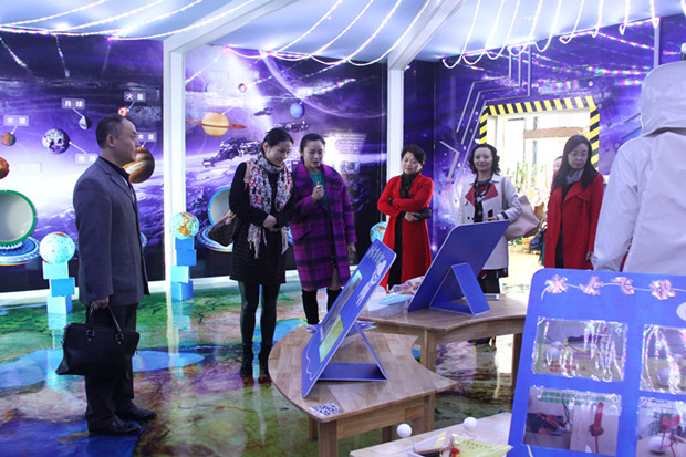 在天宁区教育文体局教育科陈青科长的陪同下,评估团首先参观了幼儿园的环境及各个专用活动室。在园所的环境建设上,紫幼人力求让幼儿园的每一个角落都能体现环保的意识:在幼儿园的走廊以及教室里,随处可见各种废旧材料制作的装饰品和教玩具。这不仅起到了美化环境的作用,更凸显了绿色的校园文明。对此,各位领导给予了高度好评。
