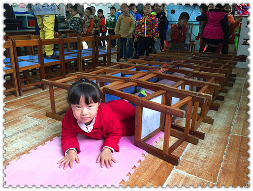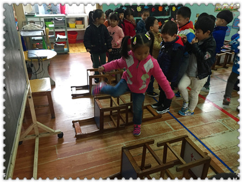 小朋友们在教室里,在老师的组织下,有的班级利用身边的有利的资源——桌子,引导孩子们走走、爬爬,有的班级将一张张椅子拼在一起变成了一个个的障碍物,让幼儿练习跨跳,有的班级制作了很多大小体育运动器械,如梅花桩、彩纸棒、拉力器、飞盘、流星球等等,让孩子在活动室、阳台、楼道、门厅等活动场所进行体育活动,……同时,幼儿园也加强了检查力度,保证了室内活动的正常开展。