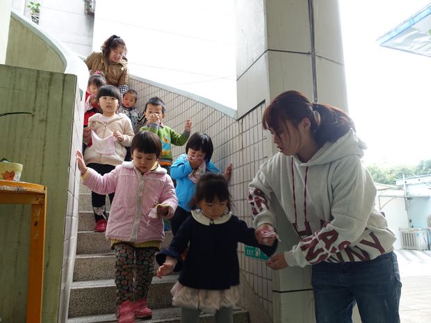 不仅在理论上,生活中,实幼教师也积极带领孩子们加入实践。快听!消防警报声已经响起。快看!各班老师根据疏散路线快速、有序地带领幼儿用湿毛巾捂住口鼻、弯下身体,快步下楼疏散到了操场,整个演练活动紧张有序。