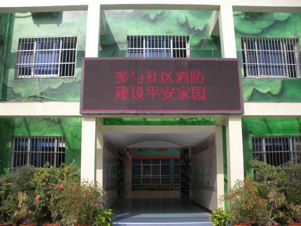 首先,幼儿园电子屏幕滚动着“参与社区消防,建设平安家园”红色宣传标语,时刻提醒着师生及家长加强消防安全意识。