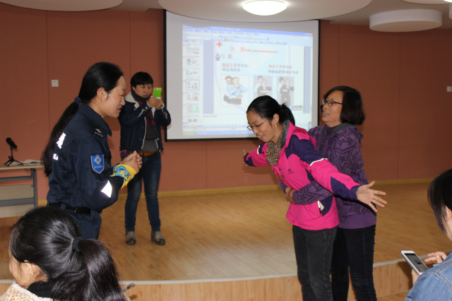 蓝天救援队队员首先为大家介绍了现场急救的意义、救命的黄金时间和观察幼儿生命体征。然后对“创伤急救术”、“异物气道梗阻急救术”、“心肺复苏术”等六种突发疾病与意外的现场急救讲解了判断病情的症状、急救的措施以及处理中的注意事项。特别对鼻出血、骨折、烫伤、脱臼以及异物进呼吸道、进耳等幼儿园意外多突发情况,进行了详细解说,并采用提问、模仿操作等互动方式帮助教师更深入地了解了急救方法。