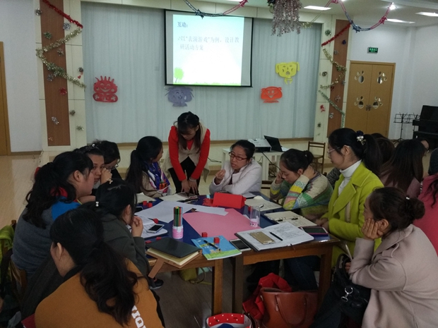 紧接着,以“表演游戏”为切入口,引发组长们去思考“如何开展有效的教研活动”。每位组员结合自身对表演游戏实施过程中的困惑积极发表着自己的观点,然后在大家集思广益下选择有价值的内容开展教研活动,在毫无准备的情况下,每组都设计出一套教研方案;接着,又采用走组式的教研模式展开了投票,与主持人互动对答,面对同行提出的质疑进行了反驳。最后,在胡敏主任的引领下,围绕“有效”进行了深入地剖析。