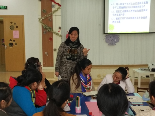 接着,张娟老师以幼儿在户外开展的自主游戏照片为例,引发教研组长们围绕“是否有开展教研活动的价值?”进行了分组式研讨:先利用小纸条写下自己的观点,再由组长统一删选出老师们都觉得有价值的内容再进行进一步了深入地探讨、互动。组长们各抒己见,仁者见仁、智者见智,就以个案中“教师在游戏中介入”“材料提供”等方面进行了思维碰撞,为我们提供了一场丰盛的知识大餐。一篇“童心解读”的案例,为到场的老师们提供了很好的学习、研讨机会。在阅他人,照自己的学习互动中,进一步积累了实践经验。