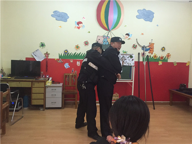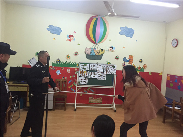 在培训中,片区民警就当前恐怖暴力的形式和如何防范与斗争等方面作了详细讲解,并对校园安防工具的使用方法进行了具体演示,他们熟练地为参培人员演示钢叉、盾牌、警棍的使用方法,再手把手地讲解正确使用防暴器材和简单的擒拿格斗技巧,警卫和教职工也进行了实际演练。片区民警强调一定要在最短的时间内又快又准地控制住暴徒,做到不让歹徒有进一步行凶的机会,不仅要遏制暴徒也要保护好自己,要尽可能将安全隐患降低到最低,迅速报警等待救援,确保幼儿园师生的生命安全。
