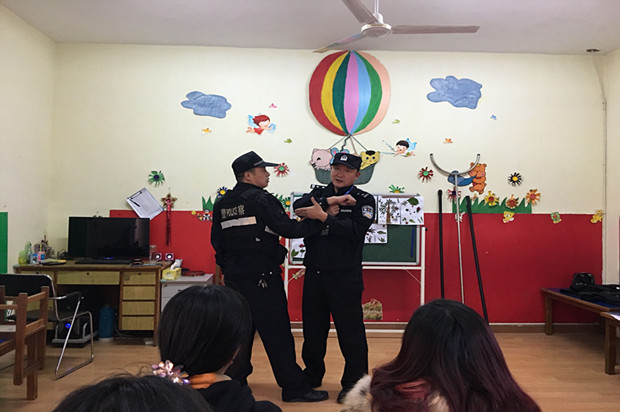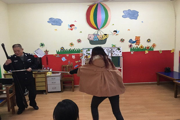 对于本次紧急演练园领导非常重视。幼儿园认真研究部署、精心策划了该活动的相关事宜。首先派出所警官对门卫和保卫处老师进行了培训。其次,警官们向大家介绍并演示了盾牌、警棍等防暴器械的使用方法,然后告诉大家,遇到突发情况首先要镇静,及时报警,要尽量把暴徒阻止在园外,最大限度地减少因突发恐怖事件对师生造成的人员伤害。最后,一名保安假设“歹徒”冲进幼儿园,教师按防暴应急预案要求手持棍棒、钢叉等,将“歹徒”围住,临危不乱,与“歹徒”交涉、周旋,设法牵制“歹徒”,在“歹徒”想要趁机逃跑时,大家合力,迅速将“歹徒”制服。演练进行得十分顺利。演练后班级教师对幼儿进行了安全教育。