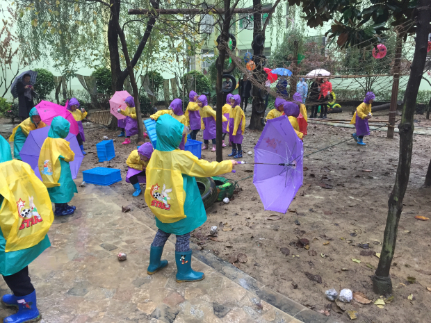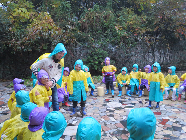 野战游戏是孩子们非常喜爱的一项运动。他们很享受在灌木丛中东躲西藏,也很享受“枪林弹雨”的感觉。可是今天的野战游戏,让孩子们更是有了全新的感受和体验。今天大班的小朋友们进行了一次别开生面的“雨中野战”。老师事先为孩子们准备了绿色和紫色的雨披,孩子们穿上后自然而然就分成了对抗的2支队伍。当孩子们身穿雨披,脚踏雨鞋来到小花园时,都掩饰不住内心的喜悦,他们伸手接雨滴,跑进泥地踩泥巴,玩得不亦乐乎。