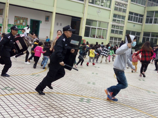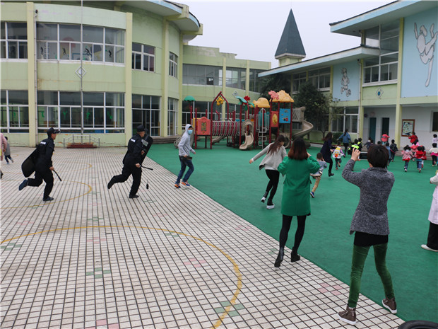 10点左右,幼儿园的孩子们正在户外活动时,一名蒙面“歹徒”带着凶器强行闯入幼儿园,冲向正在活动中的孩子,幼儿园保安小队紧急行动,按防暴应急预案手持棍棒、钢叉等,立即对歹徒进行了拦截,将“歹徒”围住,竭力保护全园师生安全。与此同时,老师们在最短的时间内疏散幼儿、帮助幼儿撤离到就近安全的教室,大家合力,迅速将“歹徒”制服,演练进行得十分顺利。演练后班级教师在安抚幼儿情绪的同时,对幼儿进行了安全教育。