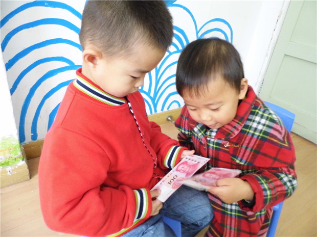 “那个数字会变色!”“它是彩色的!好漂亮!”“新的100的比旧的小!”小朋友们拿着新旧不同的人民币仔细观察着,每次发现小小的不同都会让他们很兴奋。