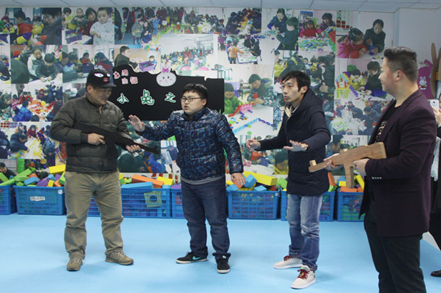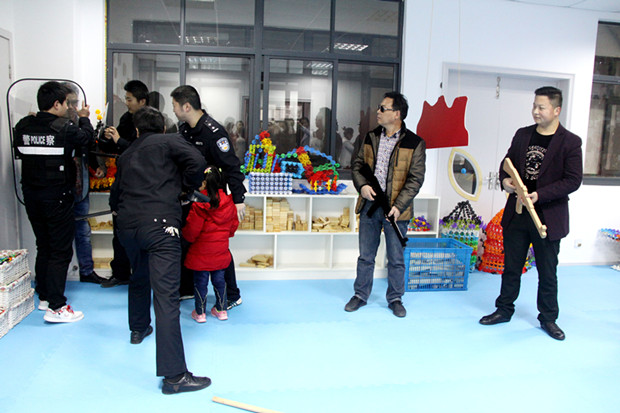 上午10时许,四名由家长志愿者假扮“歹徒”,手拿“砍刀”和“冲锋枪”凶神恶煞地闯进了青龙中心幼儿园紫云园。顿时,园内警报声大作,老师们闻讯后立即带领幼儿从操场快速转移到教室,并将教室门、窗户关紧上锁。此时,幼儿园园长负责报警,校园内的两位男教师及厨房人员则纷纷拿出菜铲、木棒、扫帚等工具冲到大厅内,全力抵抗“歹徒”。在此过程中一位幼儿被“歹徒”挟持到活动室内,“歹徒”和随后接警赶到现场的民警形成对峙,在几轮较量之后,民警最终将其将其“抓获”。