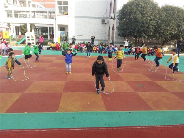 随着金老师的一声令下,比赛正式开始了。五彩缤纷的跳绳不断打在地上发出“啪啪”的声音,一阵比一阵响亮,跳绳比赛成为了幼儿园一道亮丽的风景。每个孩子分秒必争,现场气氛热烈,竞争也异常激烈,跳绳数量被不停地刷新。孩子们又一次感受到运动和健康带来的快乐。