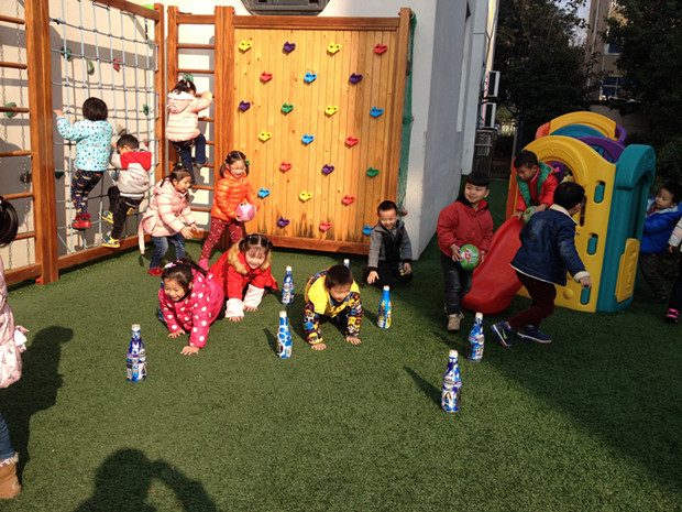 除了儿童乐园,一系列丰富的开放性材料也是孩子们户外活动的好伙伴。饮料瓶、木梯、呼啦圈这些普通的材料在每个孩子的手中都变成了有趣的“神奇道具”。饮料瓶变成了一棵棵小树苗,前进途中不能撞倒;木梯变成了过河的小桥,走在上面小心翼翼;呼啦圈变成了“魔法的陷阱”,跳进圈里就变成了一个个木头人……