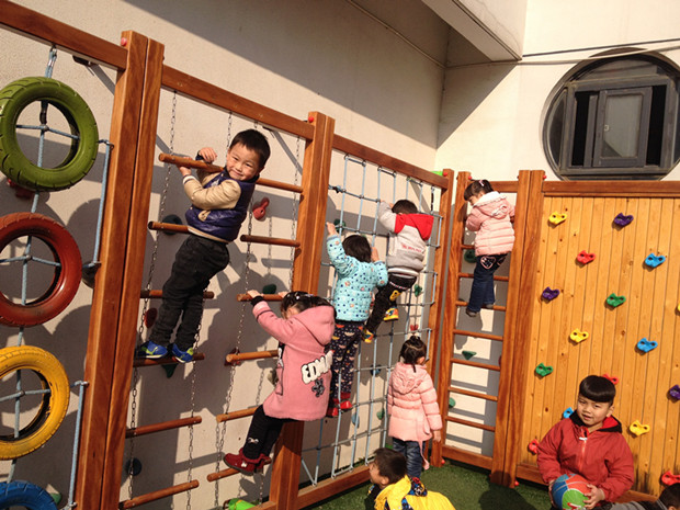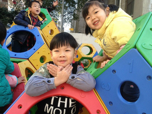 在户外的活动中,孩子们最爱的就是儿童乐园。这里有滑滑梯、攀爬架等有趣的大型游戏材料。在老师们的组织下,孩子们有序的进入场地。瞧,他们玩的可开心了,有的在挑战自我,在攀爬架上力求更上一层楼;有的在释放活力,推着轮胎驶向前方;有的在摸索前行,在滑滑梯底部的隧道里探索前行。