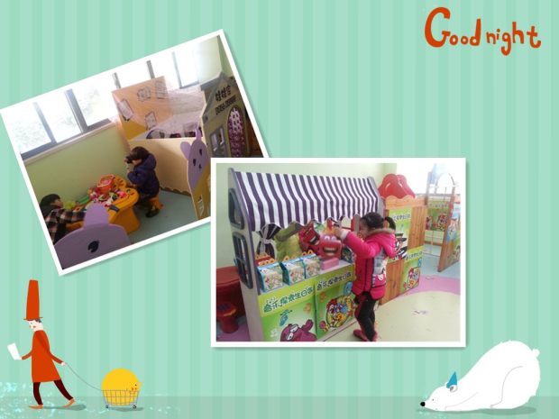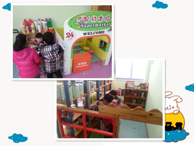 “小社区”的主角全是小朋友,孩子们承担着不同的社会角色,体验着不同的社会活动。瞧!“麦当劳”的营业员们吆喝着自家的“美味”,顾客也在兴致勃勃的购买着美食;在“儿童医院”小医生们给小病友们看病、打针;“贝贝银行”的个人理财中心里,孩子们旋转趣味密码,开启密码宝盒,将自己的宝贝存放于此;“乐乐超市”里宝贝们正在选购着自己需要的物品……此时孩子们已经和游戏融为了一体,到处洋溢着他们自信的笑容。