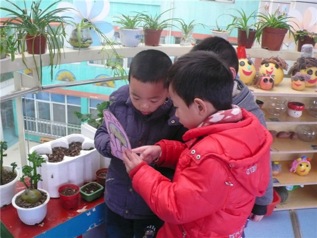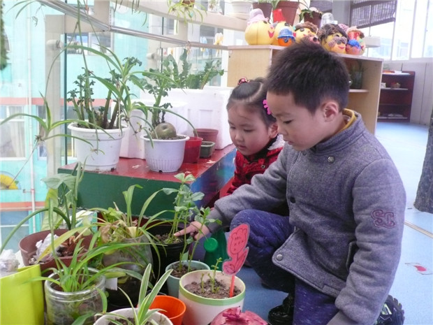 从那天开始,每天早上、午间休息时都会看到孩子们前去观望的身影,他们会时不时地交流:“怎么我种的还没有发芽呢?”、“哇,这盆里的蚕豆发芽啦,长出叶子了”、“这些花生怎么黑黑的了,坏了吗?”……在他们的迫切探究下,老师引导孩子们进行了跟踪记录,并不定期地组织孩子进行汇总交流,在这样不断观察、记录、交流中,孩子们了解到了很多关于种植的小知识,促进幼儿对自然知识的探究和观察兴趣,更从中体验到了种植的不易和辛苦。
