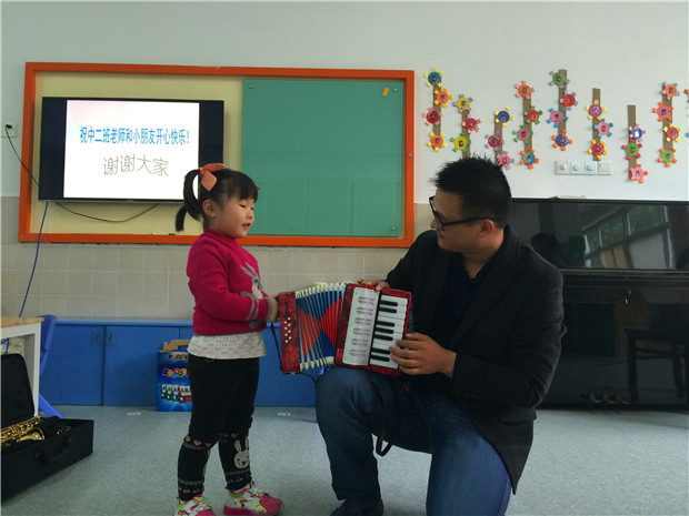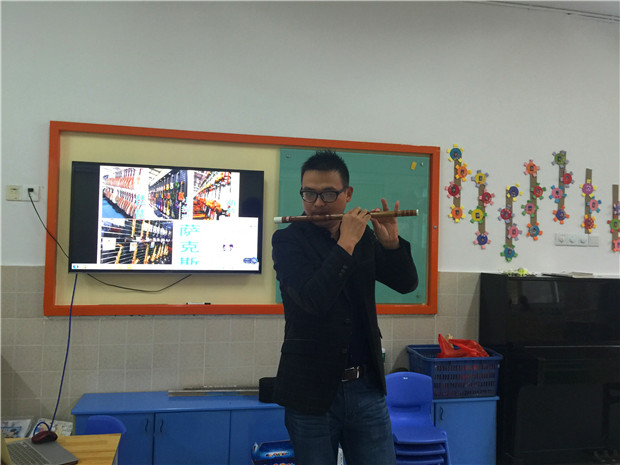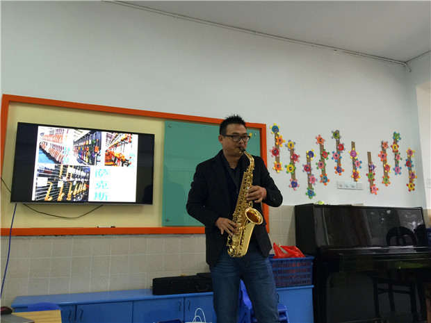首先,张爸爸为孩子们带来了中国民族乐器——笛子。首先是通过看看摸摸听听的方式认识笛子,孩子们觉得既新奇又有趣。在愉快轻松的氛围中,张爸爸还演奏了《牧民新歌》,浓郁清新的民族音乐风格不绝于耳,孩子们仿佛置身于内蒙古大草原,他们闭目感受着悠闲跳跃的节奏,想象着牧场上一派生机勃勃的喜人景象。孩子们在音乐的带动下,释放出孩童的天性,学起马儿在草原上走路、奔跑,在最放松的状态下体验民族音乐带给他们的快乐。此外,张爸爸还为孩子们带来了其他乐器,如萨克斯、箫、小提琴、葫芦丝、手风琴等,增强幼儿对乐器的兴趣,帮助孩子们建构有关常见乐器的知识经验,感受各种乐器不同的音色及演奏方式。令人感动的是张爸爸特别用心,准备充分,从教学内容的选取到乐曲乐器的准备都精益求精。张爸爸说:“看着孩子们认真听讲的清澈的眼神以及下课后孩子们围着我问个不停的稚嫩的话语,我深深感受到了做老师的不易和艰辛。”