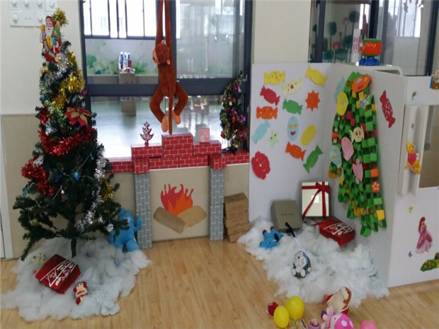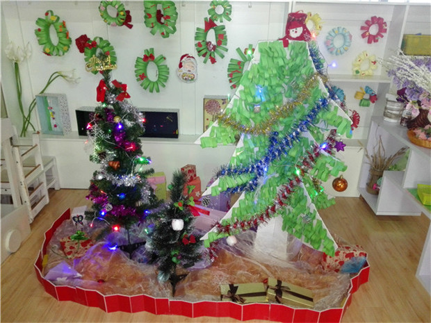 废旧包装盒用彩色的包装纸一包,摇身一变,成了精美的礼物盒,绿色的卡纸剪成条形,制成了圣诞树,窗玻璃上贴上雪花型的剪纸,小朋友用制作的手工作品做成冬爷爷的礼物,爸爸妈妈也参与进来,剪贴圣诞节的花环,在大家的共同努力下,各种各样的装饰物琳琅满目。