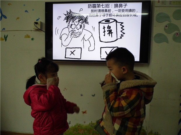 近日,持续的雾霾天气造成常州空气污染指数严重超标,看得见、抓不着的雾霾对呼吸系统发育尚未完善的幼儿群体影响较大,对人们的生活也造成了极大的影响。天宁区实验幼儿园本着“一切为了幼儿健康”的原则,积极行动起来,开展了一系列的防雾霾安全教育活动,以提高幼儿和家长的防雾霾常识。