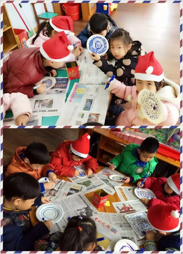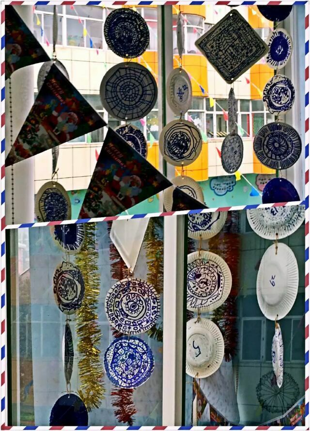 青花瓷,以其独特的历史风格和艺术魅力被誉为中国的“国瓷”,为了让幼儿感受青花瓷的清秀典雅,我班开展了“悠悠青花瓷”的班级特色区域活动,从青花瓷花纹中选取适合不同水平的孩子绘画的花纹,让孩子根据自己的水平选择花纹进行绘画,同时鼓励幼儿自己设计与众不同的图案,通过将不同的图案组合在一起,构成一幅漂亮的青花瓷作品,通过一系列的活动,既发挥了孩子学习的自主性,又锻炼了孩子的想象力和创造力,恰逢圣诞节和元旦临近,把孩子们完成的”青花瓷"作品串好后挂起来,不仅能让每个孩子都欣赏到自己的作品,还能起到装饰教室的作用,让孩子在中国风的氛围中过双节。