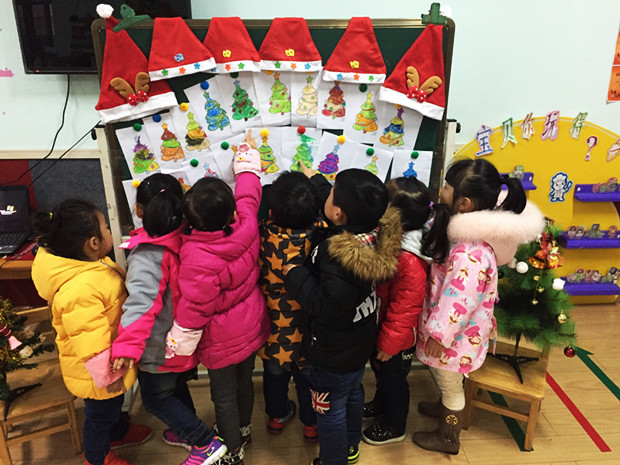 瞧,苗苗二班的孩子们正在老师的带领下开展“圣诞树儿迎圣诞”的相关活动呢。活动开展前,老师和家长一同收集了圣诞树,以便让孩子们更进一步地了解节日习俗。活动中,老师先向孩子们介绍了西方国家圣诞节的美丽传说和由来,帮助孩子们了解西方的文化传统。然后,在老师的引导下,孩子们争前恐后地来装饰圣诞树,灵巧地为圣诞树挂上铃铛、彩带、星星等。接着,伴随着《平安夜》柔和的音乐,老师带着孩子们一起认真地绘制圣诞树。孩子们用自己喜欢的颜色给圣诞树穿上了漂亮的衣服,然后再用小贴花给圣诞树加上点缀。最后,一颗颗美丽的神奇的圣诞树诞生啦!老师细心地将孩子们的作品纷纷展示在黑板上,孩子们围着作品你一言我一语,仿佛在和圣诞树神秘地对话呢!