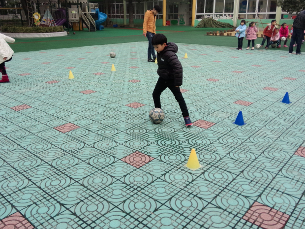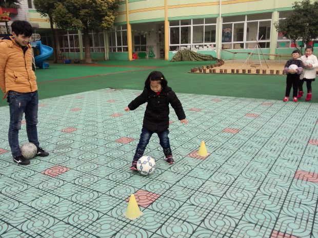 由于没有足球场地,活动只能在操场上开展,杨老师有计划、有步骤地“玩球”,让孩子们“在不知不觉中”掌握专业足球运动技巧与规则;为了不让孩子们觉得枯燥乏味,老师们把这个场景设计为“护送猪宝宝回家”、带球绕桩训练等多种形式让孩子们练球。球场上,孩子们兴奋地奔跑、追逐,一个个小脸红扑扑的,晶莹的汗水挂在鼻尖,透出这个年龄段应有的健康与活力。