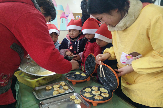 幼儿园里香飘四溢,小朋友们欢声笑语,载歌载舞。我们发挥家长志愿者的力量,请了一些有一技之长的热心家长,走进课堂,和孩子们一起过了一个独特又美味的圣诞派对。一袋玉米放进微波炉里,炸出了金黄的爆米花;把面团放进模具里,制作出了一个个可爱的小熊、小兔子、小花猫蛋糕;用草莓酱和奶粉冲泡,调制出了香喷喷的草莓牛奶。美食做好后,家长们主动分享给小朋友们,孩子们还将美食送到各个班进行分享活动。
