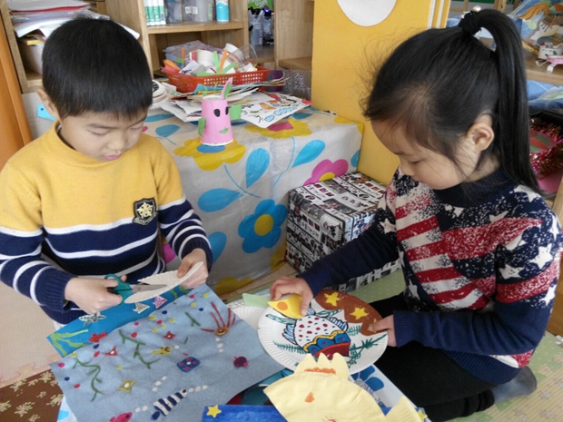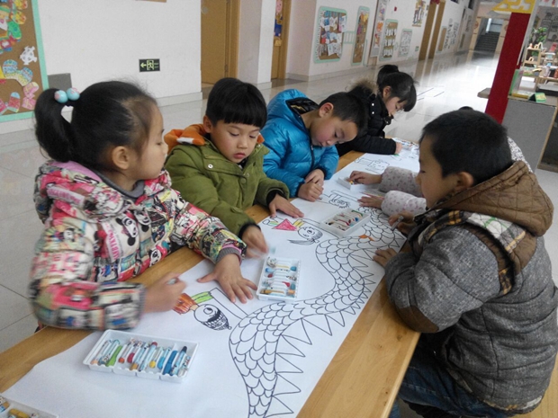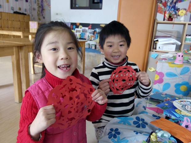 为突出中国年的“喜庆、吉祥的民族特色”,以春节红为主调,浓墨重彩渲染出红红火火的新年气象,全体师生根据预先的计划分别精心制作了红灯笼、红色窗花、红色花灯、剪纸、鞭炮福字看画等富有民族风格的新年物品,同时还组织广大家长在生活中搜集与新年相关的春联、中国结、吉祥挂件、红彩带、红灯笼等,大家将它们巧妙布置在活动室,幼儿园的公共区域里,使班级及幼儿园的每一个角落都蕴含着浓浓的年味。