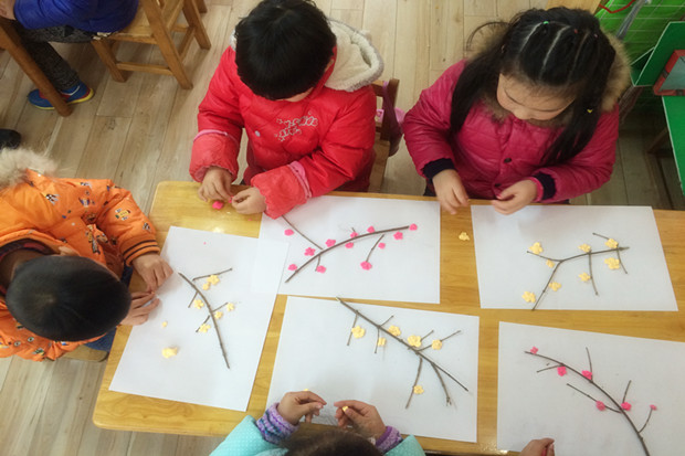 赏梅的同时,老师也不忘给孩子们介绍一下这大自然的瑰宝,让孩子们更加了解梅花的形态特征、颜色种类等等,教师结合园本陶艺特色为幼儿准备了多种操作材料,幼儿根据自己的喜爱方式来“做梅”。既丰富了自己对大自然的了解,幼儿还感受到动手制作的快乐,对梅花坚忍不拔、不屈不挠的高贵品质有了更进一步的感悟。