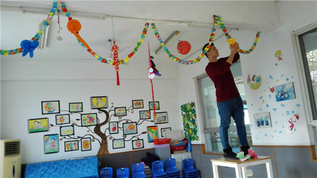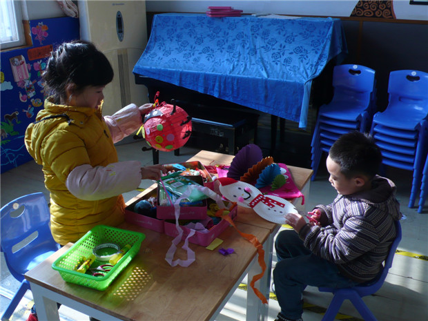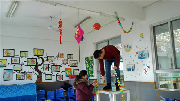 瞧!孩子们可带劲了,都纷纷动起了自己的小手,有的做、有的剪、有的画、有的贴,不一会儿,红红的灯笼、精美的手工作品、美丽的圣诞树、剪纸、一串串鞭炮、礼物、气球、彩带等一一呈现在大家的眼前。于是,在老师的帮助下,这些作品布置到了班级的各个角落里,整个教室都弥漫着新年的味道。