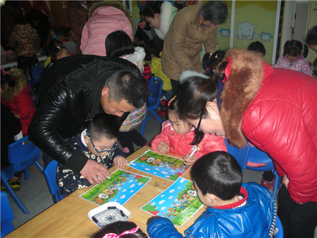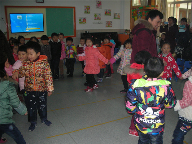 活动中,中一班的孩子们在语言活动《我的爸爸》中讲述了和爸爸在一起的有趣的事情,体验和爸爸在一起的亲情与快乐。中二班的孩子在“快乐新年大家乐”的亲子游戏中,体验到“打雪仗”“雪花飘飘”的快乐与激情,并在“文明小卫士”的引导下将活动室收拾的干干净净,既让父母见识到孩子在园的活动能力,也感受到文明礼仪应从小培养,从一点一滴的小事开始培养。中三班的孩子在音乐游戏《逛公园》中重温与父母逛公园的乐趣,并让爸爸妈妈见识到孩子们在分享阅读活动中的敏锐的观察力,持久的专注力以及全身心投入的语言表现能力。中四班的小朋友和爸爸妈妈一起为小动物找到了自己的家,让爸爸妈妈看到孩子们对小动物的了解与关爱。感受到孩子们保护小动物,呵护小动物的一片爱心。