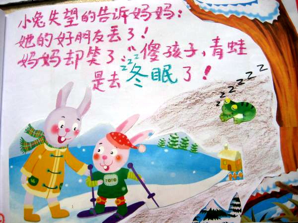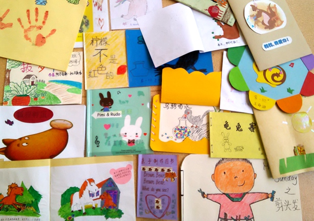 活动中,小朋友各显神通、形式多样:有的利用绘画、折纸、剪纸叙述故事内容的;有的利用了身边的废旧物品制作图书,有的用各种工具材料修补了破损的图书。自制图书更是精彩纷呈:有《小蝌蚪找妈妈》《乌鸦喝水》《花脸爸爸之营养餐》《春天的景色》《西瓜变水》等等,每本图书都展现出小朋友们合作创造的智慧和温馨的氛围,小朋友在自豪展示自己作品的同时,也在惊喜的欣赏着同伴的作品,大大地激发了孩子们的阅读兴趣。